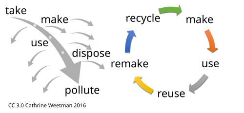 [edit]Linear "take, make, dispose" industrial processes, and the lifestyles dependent on them, use up finite reserves to create products with a finite lifespan, which end up in landfills or in incinerators. The circular approach, by contrast, takes insights from living systems. It considers that our systems should work like organisms, processing nutrients that can be fed back into the cycle—whether biological or technical—hence the "closed loop" or "regenerative" terms usually associated with it. The generic circular economy label can be applied to or claimed by several different schools of thought, but all of them gravitate around the same basic principles.[citation needed]