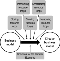 Circular business models can be defined as business models that are closing, narrowing, slowing, intensifying, and dematerializing loops, to minimize the resource inputs into and the waste and emission leakage out of the organizational system. This comprises recycling measures (closing), efficiency improvements (narrowing), use phase extensions (slowing), a more intense use phase (intensifying), and the substitution of products by service and software solutions (dematerializing).[106] These strategies can be achieved through the purposeful design of material recovery processes and related circular supply chains.[107] As illustrated in the Figure, these five approaches to resource loops can also be seen as generic strategies or archetypes of circular business model innovation. The development of circular products, circular business models, and, more generally, the circular economy is conditioned upon the affordances of the materials involved, that is the enablement and constraints afforded by these materials to someone engaging with them for circular purposes.[108]
