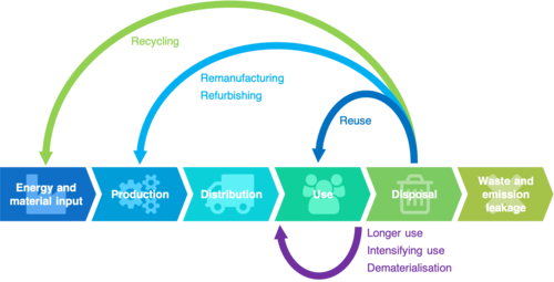 In a linear economy, natural resources are turned into products that are ultimately destined to become waste because of the way they have been designed and manufactured. This process is often summarized as "take, make, waste".[29] By contrast, a circular economy aims to transition from a 'take-make-waste' approach to a more restorative and regenerative system. It employs reuse, sharing, repair, refurbishment, remanufacturing and recycling to create a closed-loop system, reducing the use of resource inputs and the creation of waste, pollution, and carbon emissions.[30] The circular economy aims to keep products, materials, equipment, and infrastructure[31] in use for longer, thus improving the productivity of these resources. Waste materials and energy should become input for other processes through waste valorization: either as a component for another industrial process or as regenerative resources for nature (e.g., compost). The Ellen MacArthur Foundation (EMF) defines the circular economy as an industrial economy that is restorative or regenerative by value and design.[32][33]