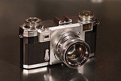 The Zeiss Ikon Model 563/24 was a complete redesign of the previous II/III cameras, and was sold by Zeiss Ikon (West Germany) from 1950 to 1961. Gone were the troublesome silk shutter straps; in their place were straps made of nylon; a flash synch was added; and the body's size and weight were reduced. Shutters were still guaranteed for 400,000 cycles. The same internal/external bayonet mount was kept. This line was an engineering and manufacturing tour de force, and is considered by many to be the finest camera ever made.[1] As with the II and III, the IIa was the base camera, and the IIIa had an added exposure meter attached on top of the camera. The shutter curtains were changed to duraluminium, lighter and faster to start and stop; however, they were thicker, too. The old Biogon did not fit, so a new one was designed together with the new Biogon 21 mm f 4, gave new perspectives to wide angle photographing.