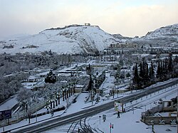 [edit]Damascus has a cool arid climate (BWk) in the Köppen-Geiger system,[32] due to the rain shadow effect of the Anti-Lebanon Mountains[33] and the prevailing ocean currents. Summers are prolonged, dry, and hot with less humidity. Winters are cool and somewhat rainy; snowfall is infrequent. Autumn is brief and mild, but has the most drastic temperature change, unlike spring where the transition to summer is more gradual and steady. Annual rainfall is around 130 mm (5 in), occurring from October to May.