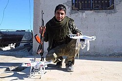 [edit]Small drones and quadcopters have been used for strikes by the Islamic State in Iraq and Syria. A group of twelve or more have been piloted by specially trained pilots to drop munitions onto enemy forces. They have been able to evade ground defense forces.[95]