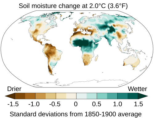 Higher temperatures increase evaporation. This dries the soil and increases plant stress. Agriculture suffers as a result. This means even regions where overall rainfall is expected to remain relatively stable will experience these impacts.[51]: 1157 These regions include central and northern Europe. Without climate change mitigation, around one third of land areas are likely to experience moderate or more severe drought by 2100.[51]: 1157 Due to global warming droughts are more frequent and intense than in the past.[52]