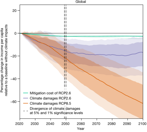 Global aggregate costs sum up the predicted impacts of climate change across all market sectors (e.g. including costs to agriculture, energy services and tourism) and can also include non-market impacts (e.g. on ecosystems and human health) for which it is possible to assign monetary values.[12]: 2495 A study in 2024 projected that by 2050, climate change will reduce average global incomes by likely 19% (confidence interval 11–29%), relative to a counterfactual where no climate change occurs. The global economy and per capita income would still grow relative to present, but the global annual damages would reach about $38 trillion (in 2005 International dollars) by 2050, and increase a lot further under high emissions. In comparison, limiting global warming to 2 °C would by 2050 cost about $6 trillion per year, or far less than the anticipated annual damages, emphasizing the economic benefits of proactive climate mitigation.[1][94]
