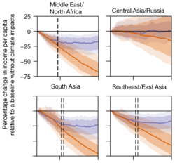[edit]A more recent modelling approach uses empirical, statistical methods to investigate how the economy is affected by weather variation.[12]: 2495 [42]: 755 This approach can cause identify effects of temperature, rainfall and other climate variables on agriculture, energy demand, industry and other economic activity. Panel data are used giving weather variation over time and spatial areas, eg. ground station observations or (interpolated) gridded data. These are typically aggregated for economic analysis eg. to investigate effects on national economies.[42] These studies examine temperature and rainfall, and events such as droughts and windstorms. They show that for example, hot years are linked to lower income growth in poor countries, and low rainfall is linked to reduced incomes in Africa.[42]: 755 Other econometric studies show that there are negative impacts of hotter temperatures on agricultural output, and on labour productivity in factories, call centres and in outdoor industries such as mining and forestry. The analyses are used to estimate the costs of climate change in the future.