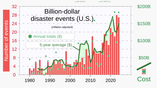 Global economic losses due to extreme weather, climate and water events are increasing. Costs have increased sevenfold from the 1970s to the 2010s.[98]: 16 Direct losses from disasters have averaged above US$330 billion annually between 2015 and 2021.[99]: 21 Climate change has contributed to the increased probability and magnitude of extreme events. When a vulnerable community is exposed to extreme climate or weather events, disasters can occur. Socio-economic factors have contributed to the observed trend of global disaster losses, such as population growth and increased wealth.[100] This shows that increased exposure is the most important driver of losses. However, part of these are also due to human-induced climate change. Extreme event attribution quantifies how climate change is altering the probability and magnitude of extreme events. On a case-by-case basis, it is feasible to estimate how the magnitude and/or probability of the extreme event has shifted due to climate change. These attributable changes have been identified for many individual extreme heat events and rainfall events.[101]: 1611 [102] Using all available data on attributable changes, one study estimated the global losses to average US$143 billion per year between 2000 and 2019. This includes a statistical loss of life value of 90 billion and economic damages of 53 billion per year.[102]