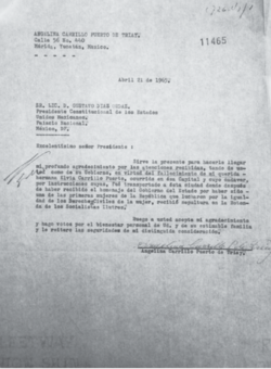 - ^ According to her official biography published online by the Senate, she died on 15 April 1968.[3] Meanwhile, Peniche Rivero states that she died in 1967 without specifying a date.[67] However, both Sauri and Cuéllar Montero state that she died in 1965, Sauri on 18 April.[69] Sauri quotes from several contemporary news stories published in 1965 to support her claim and includes a picture of a letter dated 21 April 1965 in which Adelina Carrillo, Elvia's sister, requests the support of President Gustavo Díaz Ordaz in transferring Elvia's remains to Yucatán.[70]
