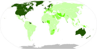 "Outer-circle" countries – such as the Philippines,[83] Jamaica,[84] India, Pakistan, Singapore,[85] Malaysia, and Nigeria[86][87] – have much smaller proportions of native English speakers, but use of English as a second language in education, government, or domestic business is significant, and its use for instruction in schools and official government operations is routine.[88] These countries have millions of native speakers on dialect continua, which range from English-based creole languages to standard varieties of English used in inner-circle countries. They have many more speakers who acquire English as they grow up through day-to-day use and exposure to English-language broadcasting, especially if they attend schools where English is the language of instruction. Varieties of English learned by non-native speakers born to English-speaking parents may be influenced, especially in their grammar, by the other languages spoken by those learners – with most including words rarely used by native speakers in inner-circle countries, as well as grammatical and phonological differences from inner-circle varieties.[82]