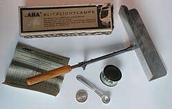 Studies of magnesium by Bunsen and Roscoe in 1859 showed that burning this metal produced a light with similar qualities to daylight. The potential application to photography inspired Edward Sonstadt to investigate methods of manufacturing magnesium so that it would burn reliably for this use. He applied for patents in 1862 and by 1864 had started the Manchester Magnesium Company with Edward Mellor. With the help of engineer William Mather, who was also a director of the company, they produced flat magnesium ribbon, which was said to burn more consistently and completely so giving better illumination than round wire. It also had the benefit of being a simpler and cheaper process than making round wire.[2] Mather was also credited with the invention of a holder for the ribbon, which formed a lamp to burn it in.[3] A variety of magnesium ribbon holders were produced by other manufacturers, such as the Pistol Flashmeter,[4] which incorporated an inscribed ruler that allowed the photographer to use the correct length of ribbon for the exposure they needed. The packaging also implies that the magnesium ribbon was not necessarily broken off before being ignited.