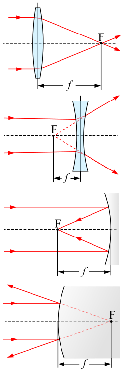 [edit]For a thin lens in air, the focal length is the distance from the center of the lens to the principal foci (or focal points) of the lens. For a converging lens (for example a convex lens), the focal length is positive and is the distance at which a beam of collimated light will be focused to a single spot. For a diverging lens (for example a concave lens), the focal length is negative and is the distance to the point from which a collimated beam appears to be diverging after passing through the lens.
