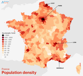 Source gives area of metropolitan France as 551,500 km2 (212,900 sq mi) and lists overseas regions separately, whose areas sum to 89,179 km2 (34,432 sq mi). Adding these give the total shown here for the entire French Republic. The World Factbook reports the total as 643,801 km2 (248,573 sq mi). | |