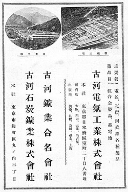 [edit]The company traces its origins to Furukawa Ichibei who founded Nikko Copper Works, a copper-smelting facility at Yokohama in 1884, which became part of Furukuwa Kogyo. A new company; Furukuwa Denki Kogyo, was formed in 1920, when it merged its copper business with its own Yokohoma Wire Manufacturing Company, which it had acquired in 1908.[3] So, the new company was able to combine its businesses of mining, refining, and making copper products, like wire and cable.[4]