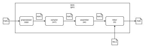 GCC's external interface follows Unix conventions. Users invoke a language-specific driver program (gcc for C, g++ for C++, etc.), which interprets command arguments, calls the actual compiler, runs the assembler on the output, and then optionally runs the linker to produce a complete executable binary.