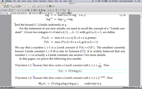 GNU TeXmacs, sometimes typeset as TeXmacs, is a scientific word processor and typesetting component of the GNU Project. It originated as a variant of GNU Emacs with TeX functionalities, though it shares no code with those programs, while using TeX fonts.[4] It is written and maintained by Joris van der Hoeven and a group of developers.[5] The program produces structured documents with a WYSIWYG user interface. New document styles can be created by the user. The editor provides high-quality typesetting algorithms and TeX and other fonts for publishing professional looking documents.