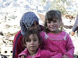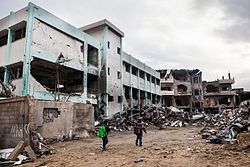 A total of 1,100–1,400[123] Palestinians (295–926 civilians) and 13 Israelis were killed in the 22-day war.[124] The conflict damaged or destroyed tens of thousands of homes,[125][126] 15 of Gaza's 27 hospitals and 43 of its 110 primary health care facilities,[127] 800 water wells,[128] 186 greenhouses,[129] and nearly all of its 10,000 family farms;[130] leaving 50,000 homeless,[131] 400,000–500,000 without running water,[131][132] one million without electricity,[132] and resulting in acute food shortages.[133] The people of Gaza still suffer from the loss of these facilities and homes, especially since they have great challenges to rebuild them.