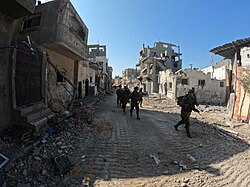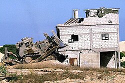 During the 1956 Suez Crisis (the Second Arab–Israeli war), Israel invaded Gaza and the Sinai Peninsula. On 3 November, the Israel Defense Forces (IDF) attacked Egyptian and Palestinian forces at Khan Yunis.[48] The city of Khan Yunis resisted being captured, and Israel responded with a heavy bombing campaign that inflicted heavy civilian casualties.[49] After a fierce battle, the Israeli 37th Armored Brigade's Sherman tanks broke through the heavily fortified lines outside of Khan Yunis held by the 86th Palestinian Brigade.[50]