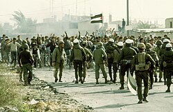 The First Intifada was a sustained series of protests and violent riots carried out by Palestinians in the Israeli-occupied Palestinian territories and Israel.[71] It was motivated by collective Palestinian frustration over Israel's military occupation of the West Bank and the Gaza Strip, as it approached a twenty-year mark, having begun after Israel's victory in the 1967 Arab–Israeli War.[72] The uprising lasted from December 1987 until the Madrid Conference of 1991, though some date its conclusion to 1993, with the signing of the Oslo Accords.