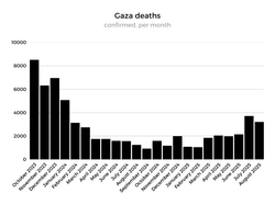 As reported by the Gaza government media office in August 2025, a minimum of 18,885 children have lost their lives since October 2023.[171] According to classified Israeli figures, 83% of the dead are Palestinian civilians. This exceeds the civilian death rate of any global conflict except the Rwandan genocide, the Siege of Mariupol, and the Siege of Srebrenica.[172]