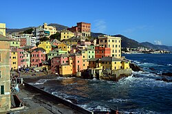 [edit]The city of Genoa covers an area of 243 square kilometres (94 sq mi) between the Ligurian Sea and the Apennine Mountains. It stretches along the coast for about 30 kilometres (19 mi) from the neighbourhood of Voltri to Nervi, and for 10 kilometres (6.2 mi) from the coast to the north along the valleys Polcevera and Bisagno. The territory of Genoa is popularly divided into 5 main zones: the centre, the west, the east, the Polcevera and the Bisagno Valley. Although much of the city centre is at a low elevation, the territory surrounding it is mountainous, with undeveloped land usually in steep terrain.