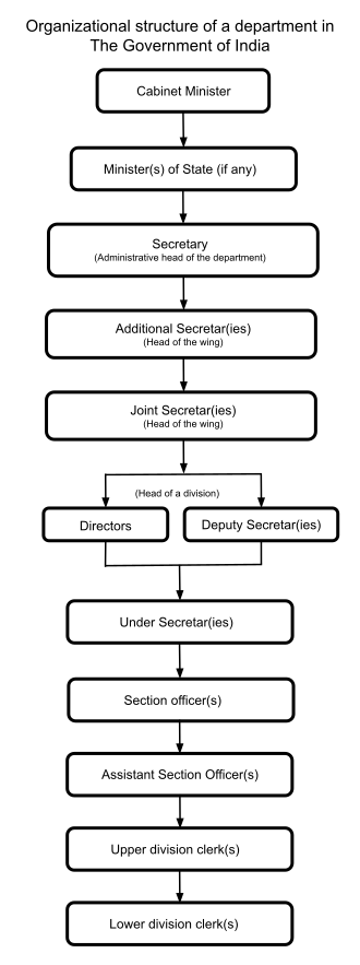 A secretary to the Government of India, a civil servant, generally an Indian Administrative Service (IAS) officer,[36][37][38][39] is the administrative head of the ministry or department, and is the principal adviser to the minister on all matters of policy and administration within the ministry/department.[40][41] Secretaries to the Government of India rank 23rd on Indian order of precedence.[42][43][44][45] Secretaries at the higher level are assisted by one or many additional secretaries, who are further assisted by joint secretaries.[41] At the middle they are assisted by directors/deputy secretaries and under secretaries.[41] At the lower level, there are section officers, assistant section officers, upper division clerks, lower division clerks and other secretarial staff.[41]