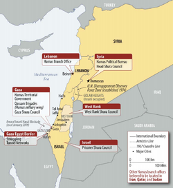Hamas was established in 1987, and allegedly has its origins in Egypt's Muslim Brotherhood movement,[72][73][74][75] which had been active in the Gaza Strip since the 1950s and gained influence through a network of mosques and various charitable and social organizations. Unlike other Palestinian factions, after the Israeli occupation of Gaza in 1967, the Brotherhood in Gaza refused to join the resistance boycott against Israel.[76] In the 1980s, it emerged as a powerful political factor, challenging the influence of the PLO, whose Fatah faction it had played a core role in creating.[76] In December 1987, the Brotherhood adopted a more nationalist and activist line under the name of Hamas.[77] Hamas was initially discreetly supported by Israel as a counter-balance to the secular PLO.[33] During the 1990s and early 2000s, the organization conducted numerous suicide bombings and other attacks against Israel.[78]