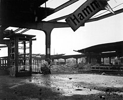 During World War II, the station was a prime target due to its strategic location and its large marshalling yard and suffered from numerous air attacks. Most of these were carried out by the British RAF Bomber Command.[8][9] Over 80% of Hamm lay in ruins after the war, and the station was no exception.[10] Passenger services resumed on 18 June 1945 on the line to Dortmund and Duisburg, and on 20 June 1945 on the lines to Bielefeld, Münster and Soest; only 6 weeks after the end of the war.