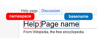 - The page name for the page you are reading is Help:Page name (Help is the namespace, and Page name is the topic). The associated talk page name is Help talk:Page name (Help talk is the namespace, and Page name is the topic).
