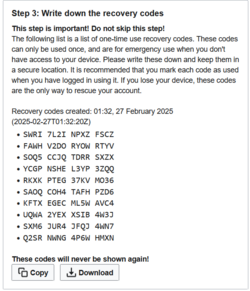 - Go back to the 2FA enrollment page. Write down the recovery codes from "Step 3" and keep them in a secure location.