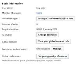 [edit]To determine whether your account has 2FA enabled, go to Special:Preferences. Under "User profile", check the entry for "Two-factor authentication", which should be between "Global account" and "Global preferences":