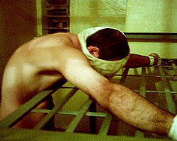 Extended forced maintenance of "stress positions" such as standing or squatting; psychological tricks and "mind games"; sensory deprivation; exposure to loud music and noises; extended exposure to flashing lights; prolonged solitary confinement; denigration of religion; withholding of food, drink, or medical care; withholding of hygienic care or toilet facilities; prolonged hooding; forced injections of unknown substances; sleep deprivation; magneto-cranial stimulation resulting in mental confusion; threats of bodily harm; threats of rendition to torture-friendly states or Guantánamo; threats of rape or sodomy; threats of harm to family members; threats of imminent execution; prolonged constraint in contorted positions (including strappado, or "Palestinian hanging"); facial smearing of real or simulated feces, urine, menstrual blood, or semen; sexual humiliation; beatings, often requiring surgery or resulting in permanent physical or mental disability; release or threat of release to attack dogs, both muzzled or un-muzzled; near-suffocation or asphyxiation via multiple detainment hoods, plastic bags, water-soaked towels or blankets, duct tape, or ligatures; gassing and chemical spraying resulting in unconsciousness; confinement in small chambers too small to fully stand or recline; underwater immersion just short of drowning (i.e. dunking); and extended exposure to extreme temperatures below freezing or above 120 °F (48 °C). - ^ "Human Rights First Releases First Comprehensive Report on Detainee Deaths in U.S. Custody". Human Rights First. February 22, 2006. Archived from the original on April 28, 2007. Retrieved May 28, 2007.