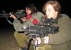 Israel is one of only a few nations that conscript women or deploy them in combat roles, although in practice, women can avoid conscription through a religious exemption and over a third of Israeli women do so.[45] As of 2010, 88% of all roles in the IDF are open to female candidates, and women could be found in 69% of all IDF positions.[46]