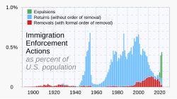 Illegal immigration is the migration of people into a country in violation of that country's immigration laws, or the continuous residence in a country without the legal right to do so. Illegal immigration tends to be financially upward, with migrants moving from poorer to richer countries.[1] Illegal residence in another country creates the risk of detention, deportation, and other imposed sanctions.[2]