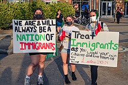 [edit]ICE again came to the forefront during the second presidency of Donald Trump, as Trump once again imposed a hardline immigration policy. Trump's administration enacted a major wave of deportations, On January 22, the DHS announced the administration was rolling back an Obama-era directive that had protected illegal immigrants in sensitive areas such as hospitals, places of worship, courtrooms, funerals, weddings and schools.[23][24] Two days later, acting Homeland Security Secretary Benjamine Huffman said the agency would deport people admitted into the United States temporarily by the Biden administration.[25] The U.S. military was deployed to assist ICE in multiple states.[26] The administration has used the Alien Enemies Act to quickly deport suspected illegal immigrants with limited or no due process,[27][28] and to be imprisoned in El Salvador.[29] Several American citizens were detained and deported.[30] Administration practices have faced legal issues and stoked controversy with lawyers, judges, and legal scholars.[27] The Trump administration began setting daily targets for ICE arrests,[31] and engaged in a controversial campaign to increase the visibility of ICE's arrests.[32][33] Some have stated that ICE during this time has been targeting "Hispanic looking" people,[34] and federal courts have found the agency to be engaged in racial profiling.[35]