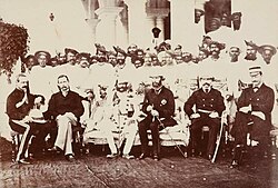 Kashirao (Dada Saheb) Holkar KCSI (Knight Commander of the Order of the Star of India), the elder brother of Maharaja Tukojirao Holkar II, receiving public recognition by the Viceroy, Lord Canning, in open durbar on 14 January 1861