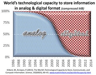 [edit]In the late 1980s, less than 1% of the world's technologically stored information was in digital format, while it was 94% in 2007, with more than 99% by 2014.[52]