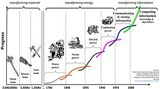 Others classify it in terms of the well-established Schumpeterian long waves or Kondratiev waves. Here authors distinguish three different long-term metaparadigms, each with different long waves. The first focused on the transformation of material, including stone, bronze, and iron. The second, often referred to as Industrial Revolution, was dedicated to the transformation of energy, including water, steam, electric, and combustion power. Finally, the most recent metaparadigm aims at transforming information. It started out with the proliferation of communication and stored data and has now entered the age of algorithms, which aims at creating automated processes to convert the existing information into actionable knowledge.[76]