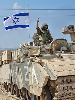 After Palestinian militant groups led by Hamas launched an attack on Israel on 7 October 2023 which saw a minimum of 1,139 largely non-combatant individuals killed, Israel declared war against Hamas.[110] Israel moved to mobilize 300,000 reservists and began to move armor close to the border with the Gaza Strip in the aftermath.[111][112] Included in the amassing of armor were Namer armored personnel carriers and Merkava tanks.[112]