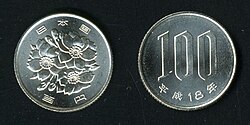 | ¥100 | 22.6 mm | 1.7 mm | 4.8 g | Cupronickel 75% copper 25% nickel |