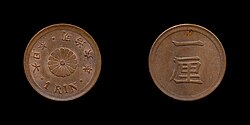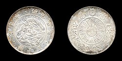 Although the Edo Shogunate collapsed with the Meiji Restoration and a new government was born, there was no immediate change to the monetary system. During this unstable period, the confusion caused by this form of exchange caused economic turmoil.[17] The gold (counting money) system of eastern Japan and the silver (weighing money) system of the western Japan were not unified, and the difference in the gold-silver ratio caused a large amount of gold to flow overseas at the end of the Tokugawa shogunate. Emperor Meiji responded to this by appointing Ōkuma Shigenobu as head of Japan's monetary reform program. He worked with Inoue Kaoru, Itō Hirobumi, and Shibusawa Eiichi to run the Ministry of Finance, seeking to introduce a modern monetary system into Japan. Ōkuma eventually proposed that coins, which were previously square, be made into circular discs, and that the names of the traditional currencies, ryō (両), bu (分) and shu (朱), be unified into yen (円), which was accepted by the government.[18] Other rejected proposals included physical weight units of "Fun" and "Momme" which never made it past the pattern stage.[19][20][21]