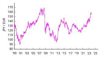 [edit]The yen declined during the Japanese asset price bubble and continued to do so afterwards, reaching a low of ¥134 to US$ in February 2002. The Bank of Japan's policy of zero interest rates has discouraged yen investments, with the carry trade of investors borrowing yen and investing in better-paying currencies (thus further pushing down the yen) estimated to be as large as $1 trillion.[46] In February 2007, The Economist estimated that the yen was 15% undervalued against the dollar, and as much as 40% undervalued against the euro.[47]