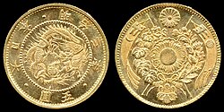 The first gold yen coins consisted of 2, 5, and 20 yen coins which were struck throughout 1870. Five yen coins were first struck in gold for the Japanese government in 1870 at the San Francisco Mint.[22] During this time a new mint was being established at Osaka, but this did not receive the gold bullion needed for coinage until the following year.[23] Gold bullion was delivered from private Japanese citizens, foreigners, and the Japanese government.[24] Initially the government opted for silver, which would become the standard unit of value, leaving gold coinage as a subsidiary.[25] While gold coinage could not be produced domestically in 1870, the mint at Osaka could produce silver coins, and these included denominations of 5, 10, 20, and 50 sen.[26][27] None of these coins dated "1870" circulated until the Meiji government officially adopted the "yen" as Japan's modern unit of currency on June 27, 1871.[28] This Act formally stipulated the adoption of the decimal accounting system of yen (1, 圓), sen (1⁄100, 錢), and rin (1⁄1000, 厘). The new currency was gradually introduced beginning from July of that year.