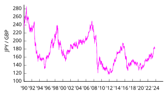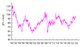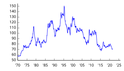 [edit]In 1985, a dramatic change began. Finance officials from major nations signed an agreement (the Plaza Accord) affirming that the dollar was overvalued (and, therefore, the yen undervalued). This agreement, and shifting supply and demand pressures in the markets, led to a rapid rise in the value of the yen. From its average of ¥239 per US$ in 1985, the yen rose to a peak of ¥128 in 1988, virtually doubling its value relative to the dollar. After declining somewhat in 1989 and 1990, it reached a new high of ¥123 to US$ in December 1992. In April 1995, the yen hit a peak of under 80 yen/US$, temporarily making Japan's economy nearly the size of that of the US.[45]