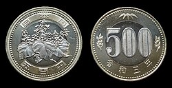 | ¥500 | 26.5 mm | 1.81 mm | 7.1 g | Bi-metallic (75% copper 12.5% zinc 12.5% nickel) |
