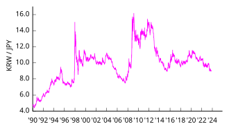 The Ministry of Finance and the Bank of Japan have sometimes intervened in the currency market in recent years, to try to slow down exchange rate movements. There were intermittent interventions from 1998 to 2003 and from 2010 to 2011 to curb excessive and speculative appreciation of the yen, and again in 2022 and 2024 to slow down speculative selling of the currency.[5] The first two interventions were coordinated with respective[clarification needed] countries,[6][7] and the IMF has repeatedly stated that Japan is "committed to a flexible exchange rate".[8][9][10]