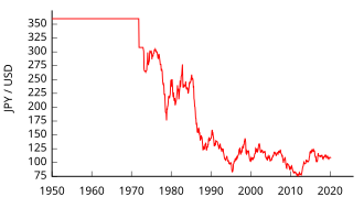 Following World War II, the yen lost much of its pre-war value as Japan faced a debt crisis and hyperinflation. Under the Bretton Woods system, the yen was pegged to the US dollar alongside other major currencies. After this system was abandoned in 1971 with the Nixon Shock, the short-lived Smithsonian Agreement temporarily reinstated a fixed exchange rate. However, since the end of that system in February 1973, the yen has been a floating currency.[4]