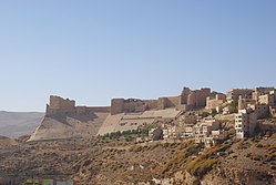 The Crusaders constructed several castles as part of the Lordship of Oultrejordain, including Montreal and Al-Karak.[58] During the Battle of Hattin (1187) near Lake Tiberias just north of Transjordan, the Crusaders lost to Saladin, the founder of the Ayyubid dynasty (1187–1260).[59] The Ayyubids built the Ajloun Castle and rebuilt older castles to be used as military outposts against the Crusaders.[59] Villages in Transjordan under the Ayyubids became important stops for Muslim pilgrims going to Mecca who travelled along the route that connected Syria to the Hejaz.[60] Several of the Ayyubid castles were used and expanded by the Mamluks (1260–1516), who divided Transjordan between the provinces of Karak and Damascus.[61] During the next century Transjordan experienced Mongol attacks, but the Mongols were ultimately repelled by the Mamluks at the Battle of Ain Jalut (1260).[62]
