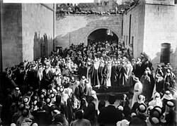 Abdullah, the second son of Sharif Hussein, arrived from Hejaz by train in Ma'an in southern Transjordan on 21 November 1920 to redeem the Greater Syrian Kingdom his brother had lost.[82] Transjordan then was in disarray, widely considered to be ungovernable with its dysfunctional local governments.[83] Abdullah gained the trust of Transjordan's tribal leaders before scrambling to convince them of the benefits of an organised government.[84] Abdullah's successes drew the envy of the British, even when it was in their interest.[85] The British reluctantly accepted Abdullah as ruler of Transjordan after having given him a six-month trial.[86] In March 1921, the British decided to add Transjordan to their Mandate for Palestine, in which they would implement their "Sharifian Solution" policy without applying the provisions of the mandate dealing with Jewish settlement. On 11 April 1921 the Emirate of Transjordan was established with Abdullah as emir.[87]