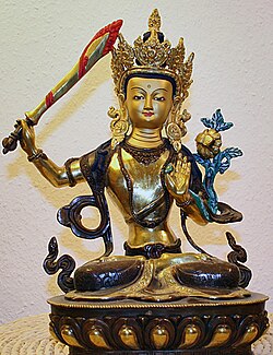 [edit]The ancient history of Kathmandu is described in its traditional myths and legends. According to the scripture of Swayambhu Purana, present-day Kathmandu was once a huge and deep lake where dwelt mythical serpents (Nāgas) like Karkotaka, Takshaka and Kulika and the Buddhas, bodhisattvas, hermits, yogis, gods and goddesses as well as other celestial beings used to come for ablution in its water. Vipassī Buddha, who lived ninety-one kalpas (aeon) ago, came on a pilgrimage and sowed the seed of a lotus in the lake which grew into a lotus flower with thousand petals. The flower emitted eternal radiant form of light with the Five Great Buddhas, Vairocana, Akshobhya, Ratnasambhava, Amitābha and Amoghasiddhi appearing on each side of the differently coloured rays of the light. Following on the footsteps of Vipassī Buddha, Sikhī Buddha and Vessabhū Buddha came to pay homage to the lotus flower thirty-one kalpas ago. Later on, Bodhisattva Manjushri came to the lake and pondered how to drain the lake so that people can traverse and pay homage to the radiant light. Out of his compassion, he drained the lake out of the valley by cutting the mountain with his indestructible sword; and created other lakes nearby to give shelter to the mythical serpents. The self-arisen ray of light in a thousand - petaled lotus came to be worshipped as Swayambhu.[20] Manjushri then established a city called Manjupattan, and made Dharmakar the ruler of the valley land. After some time, a demon named Banasura closed the outlet, and the valley again turned into a lake. Krishna came to Nepal, killed Banasura, and again drained out the water by cutting the edge of Chobhar hill with this Sudarshana Chakra. He brought some cowherds along with him, and made Bhuktaman the king of Nepal.[21][22][23]