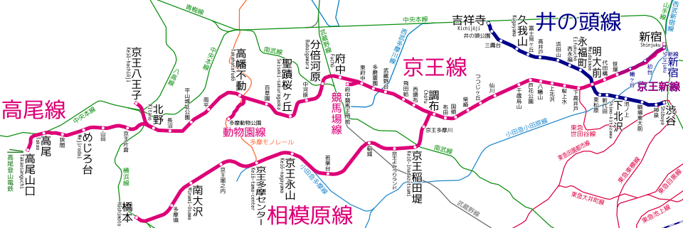 The name 'Keio' (京王) is derived from taking one character each from the places through which the railway runs: Tokyo (東京) and Hachiōji (八王子).[4]