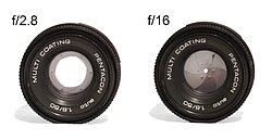 The aperture affects not only the amount of light that passes through the lens, but also the depth of field of the resulting image: a larger aperture (a smaller f-number, e.g. f/2.0) will have a shallow depth of field, while a smaller aperture (a larger f-number, e.g. f/11) will have a greater depth of field.[3]
